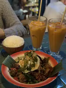 Saw a highly rated Thai restaurant "Sip Song" on OpenRice, ordered minced pork with basil leaves on rice, grilled pork neck skewers, and Thai milk tea, and was very satisfied (although a bit pricey ><)