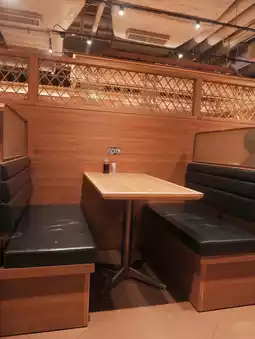 Near the entrance is the self-service area, mostly wooden booth seats,