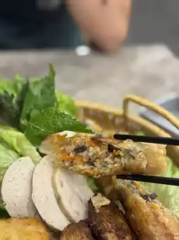 Vietnamese Fried Shrimp Cake: Fried to golden crispiness, generously sized, with firm and bouncy shrimp 🦐 meat. Dip it in Thai chili sauce for a perfect sweet, sour, and spicy match. The spring rolls are finger-licking good, made with wood ear mushrooms, pork, vermicelli, and radish for extra bite, leaving a lingering fragrance. The hot meat juice bursts out with each bite, so be careful not to burn your mouth.