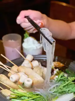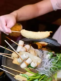 Served on a hot stove to maintain its temperature, the clear and light broth is incredibly flavorful. It includes skewered fish cakes, fish paste, and chikuwa, which are tender, bouncy, and absorb the broth well. Additional ingredients include translucent glass noodles, crisp and tender Chinese lettuce, sweet and soft white radish, enoki mushrooms, and wood ear mushrooms. You can also dip them in Korean-style sauce for extra flavor.