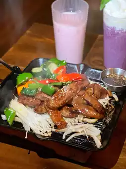 The thick slices of pork neck are particularly satisfying, with the right amount of fat and connective tissue. The meat is tender and delicate, infused with a rich soy sauce aroma, and accompanied by enoki mushrooms, onions, and chili peppers.