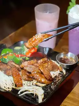 This Korean restaurant has a notable background, originating from a fried chicken brand in Busan, South Korea. It specializes in authentic Korean cuisine. The interior is spacious and comfortable, adorned with a romantic atmosphere featuring love locks hanging on wire mesh and star-shaped pendant lights on the ceiling.