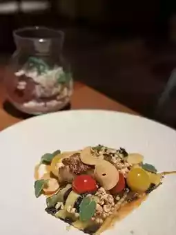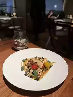 After ordering, they served hot bread 🥖 We each chose one appetizer and one main course. First, Ratatouille Soup, a French vegetable soup with tender abalone and rich confit vegetables, full of layered flavors. Also, Baby Artichoke Barigoule, crispy fried artichokes paired with pickled octopus, fresh and appetizing.
