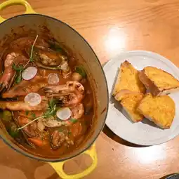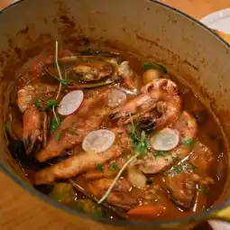 The French Marseille fish soup is very rich, paired with tender Spanish red snapper, fresh mussels, and springy large shrimp. You can dip bread into it, creating a rich texture😋