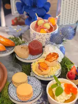 As soon as it arrives, you see a blue and white porcelain platter filled with exquisite sweet and savory treats,