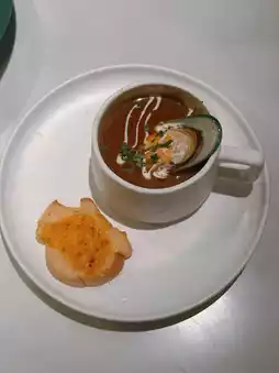 French Lobster Seafood Chowder🦞 Add-on $22💰 The lobster flavor is a bit mild and the texture is a bit thin🥺 Served with toast🥖
