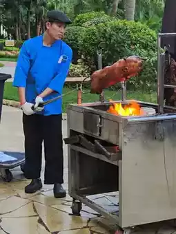 Every weekend and public holiday, we offer charcoal-grilled crispy suckling pig, which is grilled and cut immediately.