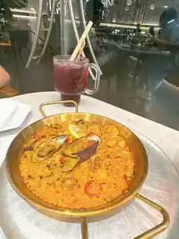 Combined with a generous helping of seafood, including shrimp, mussels, and squid, the rice soaks up the rich seafood broth, creating a fragrant aroma and a rich, complex flavor profile. It's definitely a highlight of the main course.