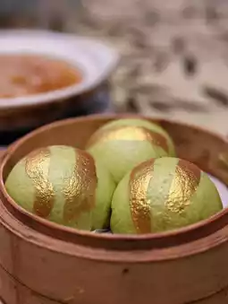 Steamed to order, the green wrapper is fluffy and soft, and the custard filling oozes out when you bite into it, with just the right amount of sweetness!
