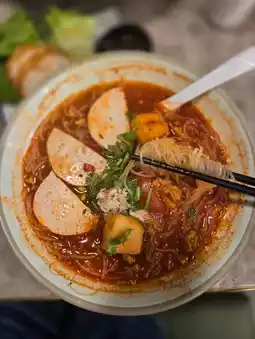 The newly opened "Hanoi Vietnamese Cuisine" restaurant in Tsuen Wan Plaza specializes in authentic Vietnamese cuisine. Its décor is rich with Vietnamese-inspired elements, including paintings of Vietnamese women and bamboo hats on the walls, creating a rich and exotic atmosphere. The menu offers a diverse selection, including Vietnamese-style pho, thai bao, rice paper rolls, and specialty drinks. Signature dishes include the tomato and crab meat thai broth, which boasts a sweet and rich broth and generous toppings. The lemongrass pork chop is also deliciously prepared. Hot drinks are available for an additional 5 yuan, while cold drinks are 8 yuan, making it a reasonably priced option for authentic Vietnamese cuisine in Tsuen Wan.