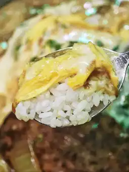 Cheese🧀Waterfall Curry Hamburger Steak Rice is a double enjoyment of sight and taste👅, hot cheese and 🍳scrambled eggs flow down like a waterfall💦, covering the whole curry rice🍛 and burger steak, the picture is shocking🤩! The burger steak is juicy, rich and delicious 🔥, with smooth cheese🧀, every bite is full of rich cheese and curry flavor✨, and it is made of iron plate🍳, hot so there will be a little rice crust at the end😋.