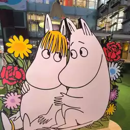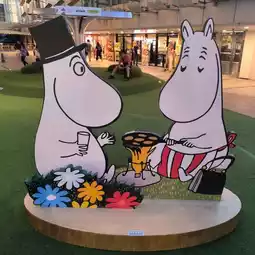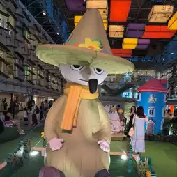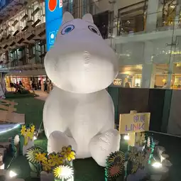 Super-sized (approximately 3 meters tall) Moomin & Shriki, plus their blue Moominhouse and a tree elf. Check it out! If you're a Moominvalley fan, don't miss it.