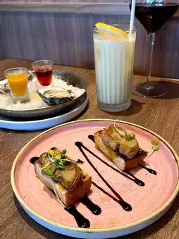 For drinks, try a glass of red wine 🍷. The tannins are relatively soft, and the acidity is moderate, making it an easy-drinking wine that pairs well with a variety of dishes. If you don't like alcohol, try a Virgin Colada 🍹. It's sweet and sour, and the aroma of pineapple juice is refreshing. Cheers!