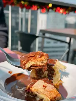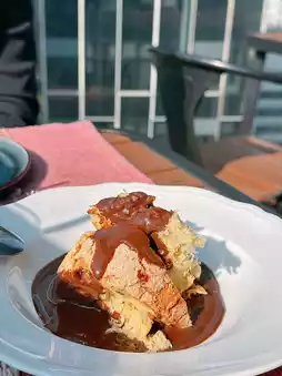 The cake is exquisitely presented, with a soft texture and a natural aroma of dried fruits and nuts. Paired with the rich chocolate sauce, the cake has a rich, layered flavor, making it the perfect end to lunch.