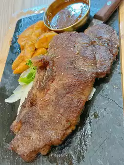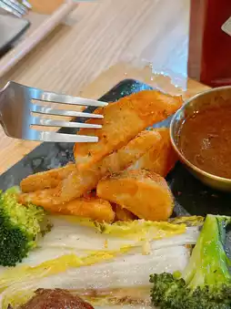 The steak is seared to perfection, with a lightly charred exterior and a juicy, pink interior. The beef flavor is rich, and the aroma of the sizzling hot plate makes it even more appetizing. Served with stir-fried vegetables and crispy potato wedges, it's a satisfying and filling meal.