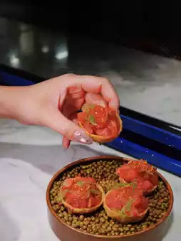 Featuring wild Spanish deep-sea red shrimp, the shrimp heads are used to create a rich, orange-red oil. Combined with short-grain rice Slow-cooked in an onion and tomato sauce, the rice is tender on the outside and slightly firm in the center. Each grain of rice is infused with the sweetness of shrimp paste and the aroma of saffron. A layer of golden, slightly charred rice forms on the bottom of the pan.