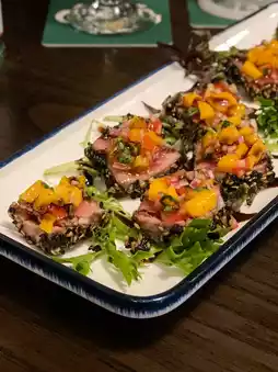 Seared tuna served with black and white sesame seeds, which are aromatic and crispy due to grilling. Paired with mango tartare, it adds a layered flavor.