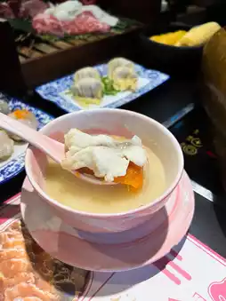 A limited-time soup base🍲 featuring a creamy white broth with enoki mushrooms, whole papaya, and grouper fillets. Once boiled, the staff will cut the papaya into chunks🍈. Start with a bowl of hot soup🥣—the thickly sliced grouper fillets are tender and infused with the broth's rich, sweet flavor🐠👍🏻.