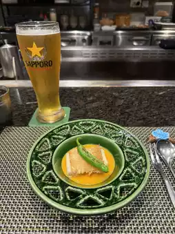 The golden eagle scallops were grilled with a dragon pumpkin and sea urchin cream sauce. The crispy skin and tender fish were absolutely delicious.