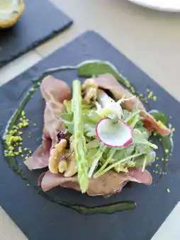 Thinly sliced cured beef wrapped around light and airy cheese, paired with nuts and sweet raisins, creating a complex and delightful flavor profile.