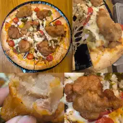 Every time I come, I miss this fried chicken pizza, the fried chicken meat is very juicy, the pizza is down with chili powder, the spiciness is relatively as difficult as last time, the pizza is thin pizza, each pizza has a piece of fried chicken on top, the pizza other ingredients are pineapple, purple onion, bell pepper and cheese.