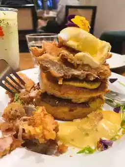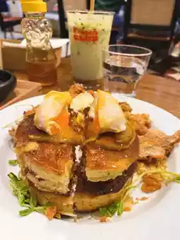 The presentation is very attractive 😍. Large portion. The fried chicken is crispy, tender, and delicious 😋. The pancake is thick, dry, slightly sweet, and average. Very filling 😂.