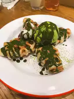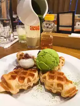 The waffle isn't your typical crispy, buttery waffle. This one is more like bread, not crispy, but soft. The ice cream has a strong matcha flavor, and the matcha syrup is quite bitter. It would be better if the overall flavor was a little sweeter.