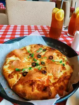 🍕 Smoked Salmon and Salmon Roe Pizza: Six slices of fluffy yet slightly crispy pizza. The smoked salmon is savory and flavorful, with a rich and fresh taste profile. Plus, the cheese pull is amazing—so cheesy!