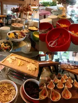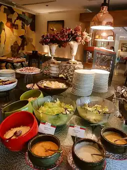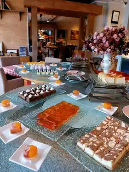 🥗🍰 The appetizer bar features duck breast, prawns, assorted cheeses, fresh salad greens, and freshly baked bread. The soup of the day, pumpkin soup, is rich and creamy. For desserts, there’s a variety of cakes (cheesecake, chocolate, Basque, mango, etc.), four types of seasonal fruits, and panna cotta.