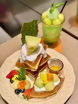 The waffles are crispy on the outside and soft on the inside, topped with honeydew melon, honeydew melon cream, strawberries, and blueberries for a sweet and fruity flavor.