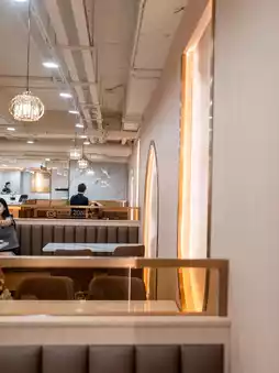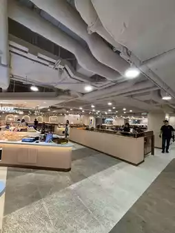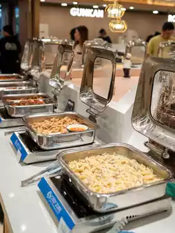 The restaurant's interior is spacious and brightly lit, with food divided into different sections: hot dishes, sushi & rolls, sashimi, fried items, baked goods, ice cream & desserts, fruits, salad bar, and more. The most eye-catching area is the Chef’s Zone, where you can find freshly made dishes like three-color pancakes, LA ribs, and puff pastry soup, all filling the air with irresistible aromas.
