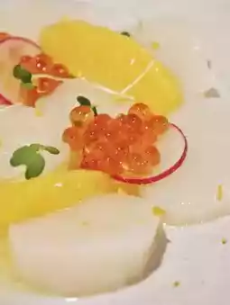 Appetizer Orange stained Hokkaido sashimi scallops🍊, full of fusion, scallop sashimi meat is plump and fresh😍, after using orange stains more fresh fruity flavor🌟, very appetizing.