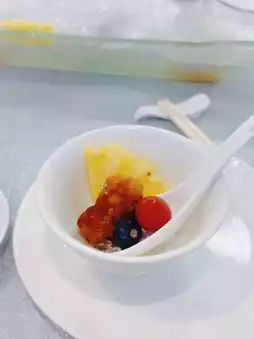 Colorful iced sweet and sour black pork (8 pieces) 🐖 sweet and sour black pork covered with ice 🧊 sweet and sour pork skin is cool, but still retains a thin and crispy taste 😆 The meat is fluffy, fat ratio is even 💯 cold outside and hot inside ❄️🔥 moderate sweet and sour 😋 There are also cherry tomatoes 🍅 blueberries 🫐 pineapple 🍍