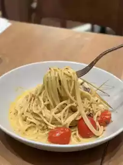 The tom yum has a prominent flavour, sour and spicy and quite appetizing. The seafood is mussels, squid and prawns. The pasta is quite juicy, with a feeling of getting spicier the more you eat