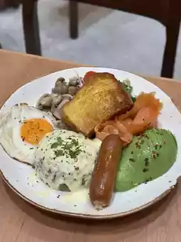 A generous portion all day breakfast!! Cheeseburger steak is thick and juicy, and is very rich with poached eggs, avocado, cheese sausage, smoked salmon, mushrooms, toast and salad
