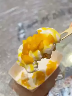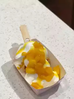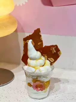 A layered mix of white and yellow, this dessert also uses yogurt ice cream as the base, drizzled with naturally fragrant wild honey that is sweet but not overwhelming. It is paired with fresh, juicy mango chunks, chewy plain mochi, and two crispy almond flakes that offer a rich almond aroma.