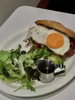 Side dishes include poached eggs, pork, crispy asparagus and sprouts