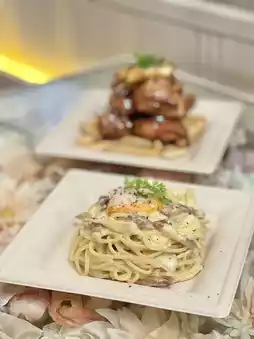 The carbonara is topped with an egg yolk, which, when mixed in, makes the pasta creamier and adds a rich egg flavor. Each strand of pasta is well-coated with sauce. The acorn-fed Iberico pork is tender with a nice bite, offering a savory and salty taste.