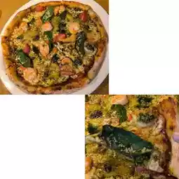 This Pizza belongs to the large batch, a total of 8 pieces of Pizza, Pizza ingredients include Italian pesto, shrimp, a little salmon, grilled bell peppers, tomatoes and mozzarella cheese.
