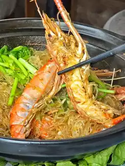 The giant prawns are split open and baked with glass noodles and garlic. The prawn meat is firm and bouncy, while the glass noodles soak up the essence of the prawn roe and garlic, making the dish aromatic and flavorful.