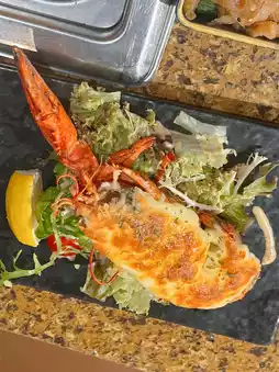 Cheese Baked Boston Lobster ๐ฆ Package includes ๐ฐ The lobster is large and fresh ๐, paired with savory cheese ๐ง and a side salad ๐ฅ