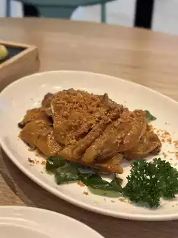 The chicken skin is crispy and sprinkled with a lot of garlic. The chicken is flavourful and tender but not dry