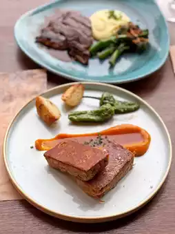 The signature Spanish suckling pig features a thin, crispy skin and tender, melt-in-your-mouth meat. Served with sweet pumpkin puree, roasted potato wedges, and Spanish green peppers.