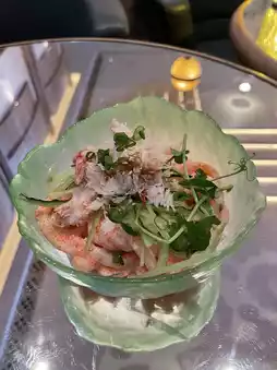The crab meat tastes clear and sweet, and the salty and fresh taste of mint with udon tastes good.