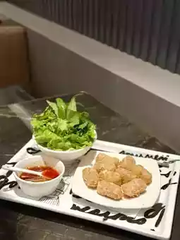 We ordered a few dishes to share! First, the Vietnamese-style fried crab spring rolls were golden and crispy, with a generous filling. Pairing them with vegetables made them less greasy.