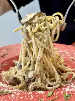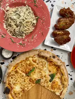 Ordered a 12-inch Margarita pizza. There are five BBQ chicken wings, sweet and spicy like Korean sauce, slightly salty. Truffle Cream Linguine is the highlight, the pasta is bouncy, the cream sauce is rich, mushrooms and shredded cheese are a plus, and although the truffle flavor is not too strong, the overall flavor is unstoppable!