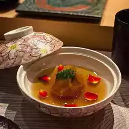 Served with grilled sole, homemade marinated salmon roe, sea salt and chrysanthemum petals, the dish has a unique flavor of grilled sole and fish oil.
