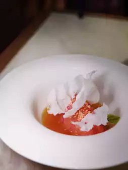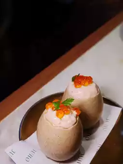 Tuna mayonnaise foam, crafted using molecular gastronomy techniques, floats lightly like a cloud within the porcelain egg dish. ☁️