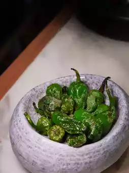 Using Spanish baby green peppers, they have a delicate, slightly wrinkled skin and tender flesh. Lightly fried in olive oil, they exude a burst of peppery aroma. 🥰