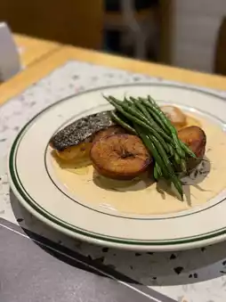 The salmon was perfectly seared—crispy on the outside and tender on the inside. The tangy sorrel sauce added depth to the flavor. The side dishes of pan-fried potatoes and green peas were also excellent, creating a well-balanced meal.